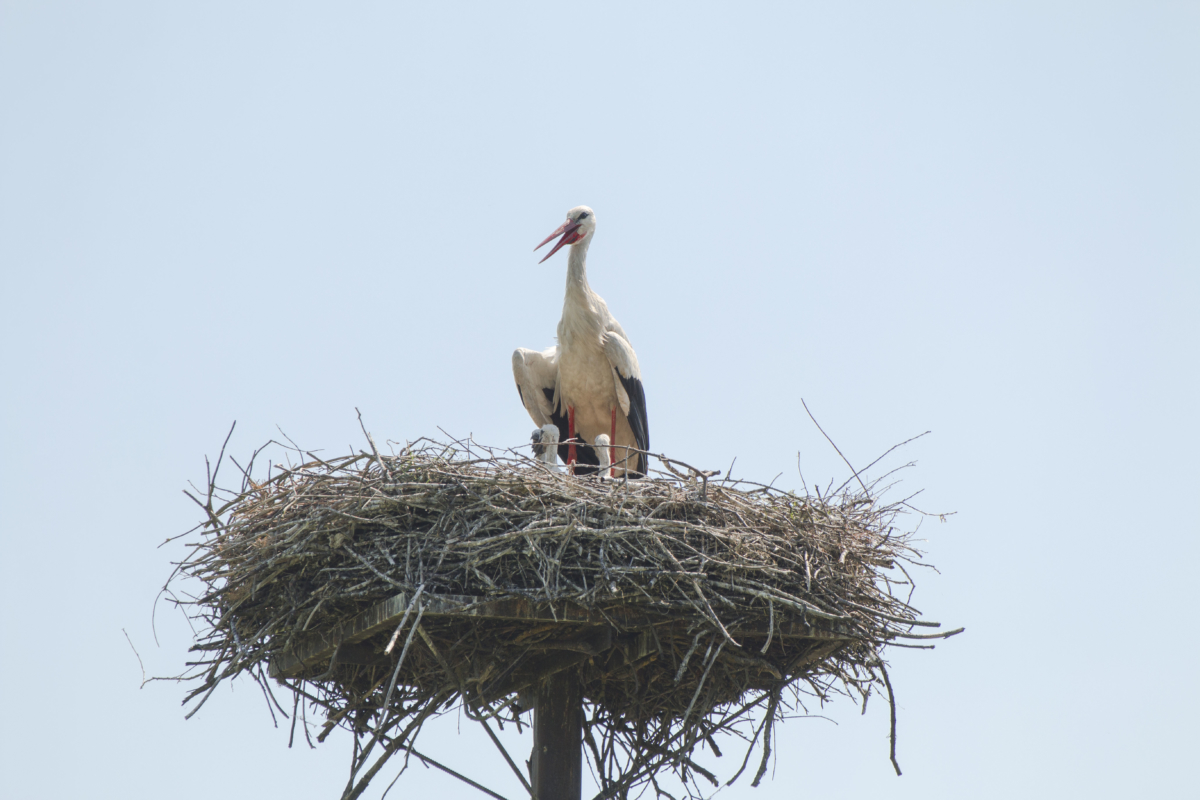 Young storks protected from the sun by the mother’s wings. North Poland, Biebrza National Park.