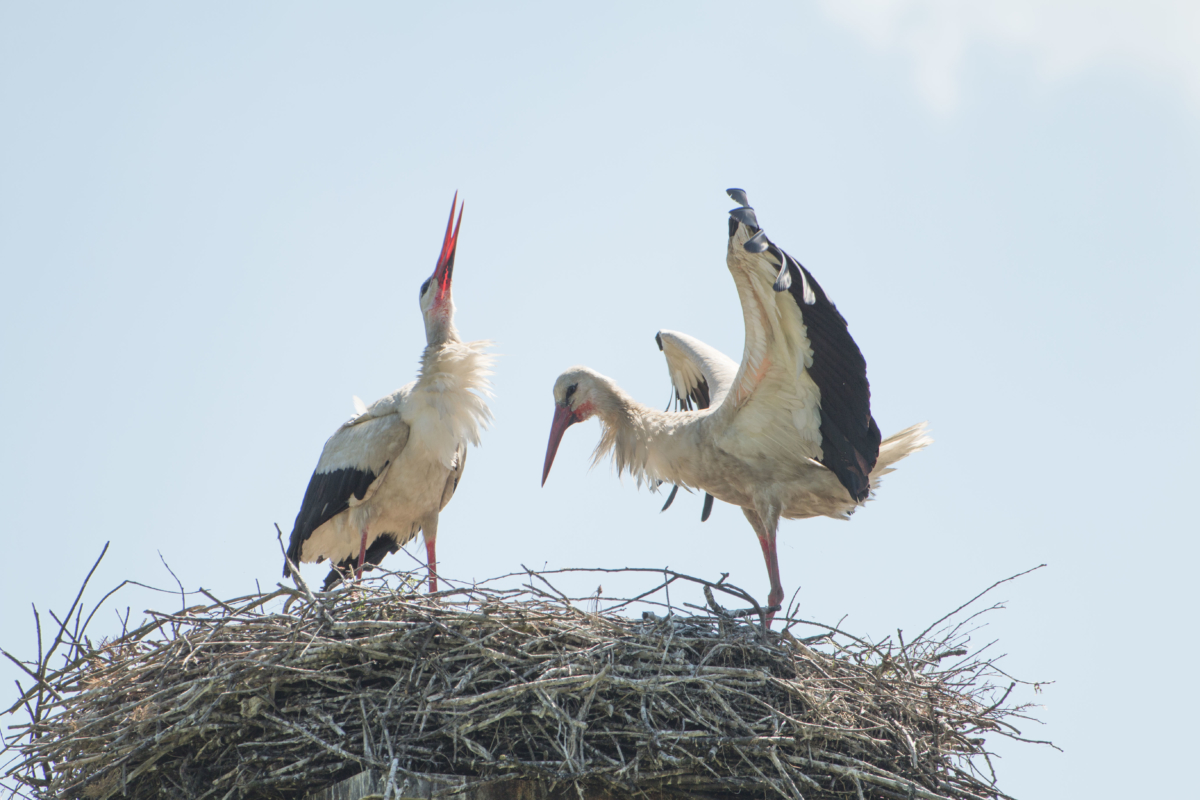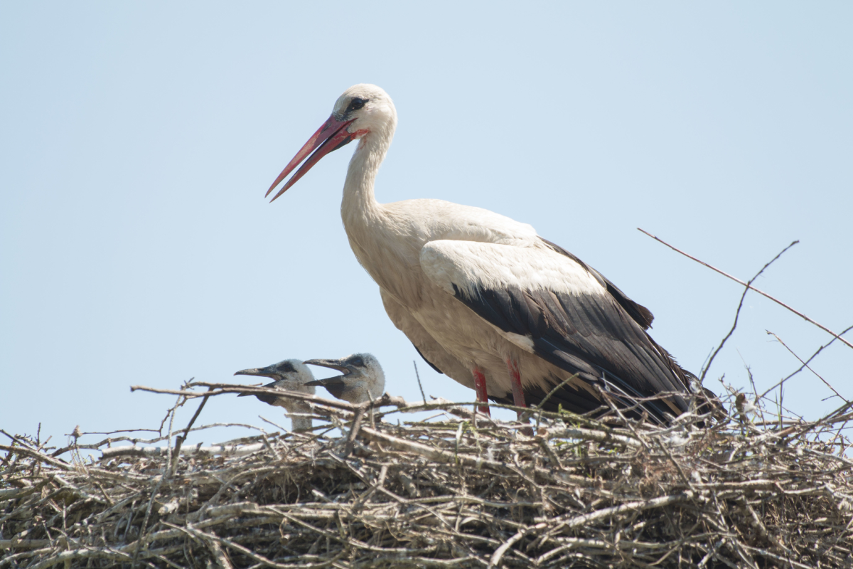 Na pierwszym zdjęciu małe bocianki chronione skrzydłami bociana przed słońcem. Północna Polska, Biebrzański Park Narodowy.